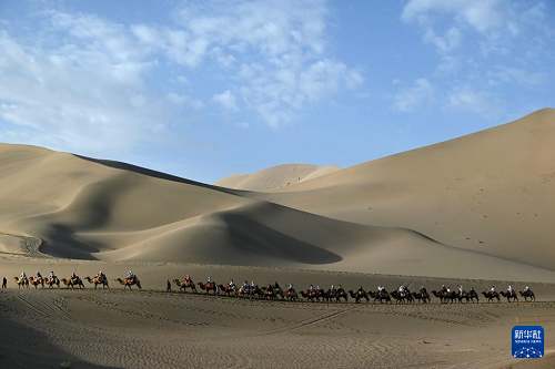 8月23日,游客在甘肅省敦煌市鳴沙山月牙泉景區(qū)游覽。(新華社發(fā) 張曉亮 攝)