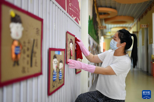8月25日,山東省青島市嶗山區(qū)金家?guī)X街道中心幼兒園員工在擦拭走廊畫(huà)框。(新華社發(fā) 王海濱 攝)
