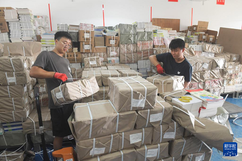 8月25日,在河南省沁陽(yáng)市新華書(shū)店教材倉(cāng)庫(kù),工作人員在配發(fā)新學(xué)期教材。(新華社發(fā) 楊帆 攝)