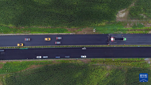 8月28日,在鐵科高速公路延壽縣至尚志界段主線,大型機械設備在進行瀝青攤鋪收尾作業(yè)(無人機照片)。(新華社記者 王松 攝)