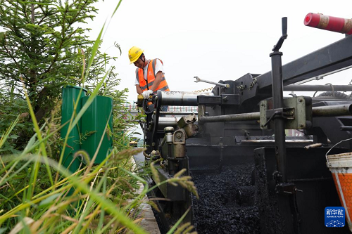 8月28日,技術人員在監(jiān)測攤鋪瀝青溫度。(新華社記者 王松 攝)