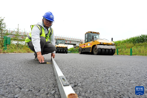 8月28日,技術人員在監(jiān)測瀝青攤鋪平整度。(新華社記者 王松 攝)