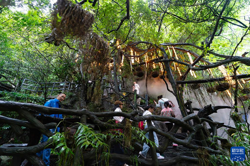 8月27日,游客在廣南縣六郎城村以鐵皮石斛康養(yǎng)旅居為特色的“六郎城·仙草秘境”景區(qū)游覽。(新華社記者 高詠薇 攝)