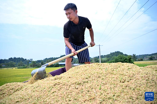 9月1日,在四川省內(nèi)江市東興區(qū)田家鎮(zhèn)趙家壩社區(qū),農(nóng)機手在水稻搶收現(xiàn)場裝車。(新華社發(fā) 李建明 攝)