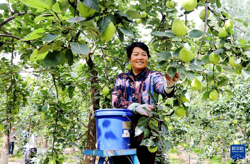 9月1日,甘肅省平?jīng)鍪徐o寧縣界石鋪鎮(zhèn)高堡村村民在采摘早酥梨。(新華社發(fā) 王毅 攝)