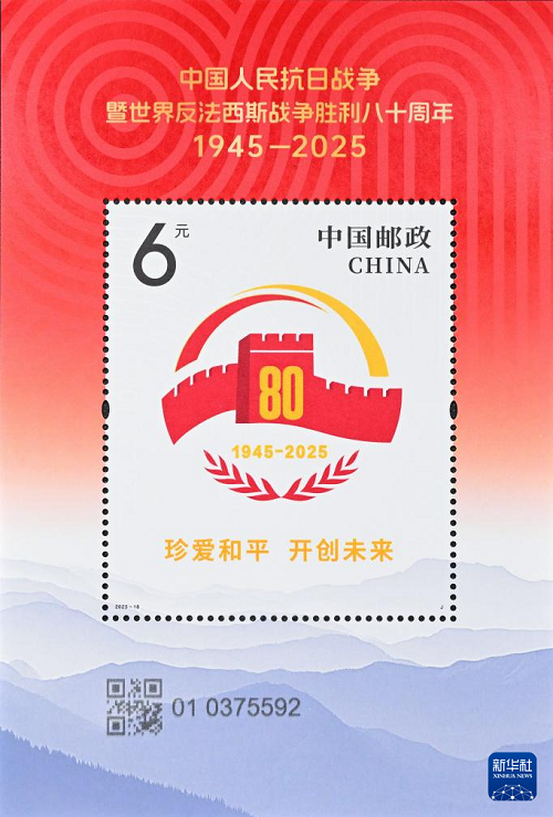 這是9月3日拍攝的《中國(guó)人民抗日戰(zhàn)爭(zhēng)暨世界反法西斯戰(zhàn)爭(zhēng)勝利八十周年》紀(jì)念郵票小型張。(新華社記者 李賀 攝)