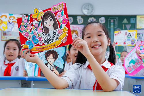 9月9日,在江蘇省句容市實驗小學(xué),學(xué)生展示手工制作的教師節(jié)賀卡。(新華社發(fā) 鐘學(xué)滿 攝)