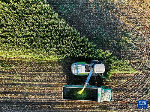 9月18日,在通遼市扎魯特旗巨日合鎮(zhèn),農(nóng)機在田間收割青貯玉米(無人機照片)。(新華社記者 連振 攝)