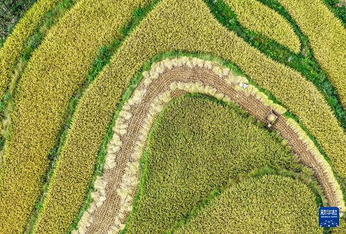 地處武陵山區(qū)腹地的重慶市黔江區(qū)五里鎮(zhèn)水稻種植面積5300畝,是武陵山地區(qū)糧食主要產(chǎn)區(qū)之一。秋收時節(jié),金黃色的水稻鋪滿山坡,稻農(nóng)們利用晴好天氣搶收稻谷,呈現(xiàn)出一派美麗的豐收畫卷。