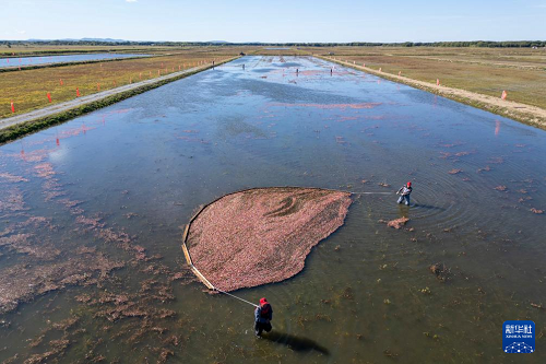9月21日,在撫遠市蔓越莓種植基地,工作人員在采收蔓越莓。(新華社記者 張濤 攝)