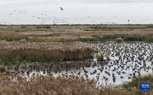 10月13日,在黑龍江省雞西市密山市興凱湖國(guó)家級(jí)自然保護(hù)區(qū),一群候鳥在濕地中覓食(無人機(jī)照片)。(新華社發(fā) 孫海淇 攝)