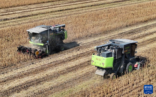 10月21日,收割機(jī)在天津市薊州區(qū)下窩頭鎮(zhèn)收獲大豆(無人機(jī)照片)。(新華社記者 李然 攝)