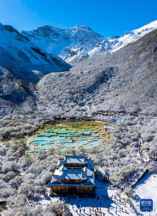 10月21日,四川省阿壩藏族羌族自治州黃龍景區(qū)迎來今秋第一場降雪,五彩池與皚皚白雪交相輝映,美不勝收。