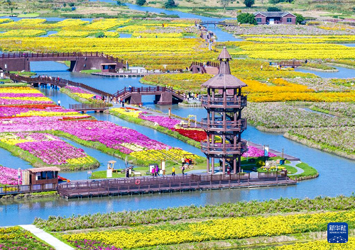 10月23日,游客在江蘇省興化市千垛景區(qū)賞菊游玩(無人機照片)。(新華社發(fā) 周社根 攝)
