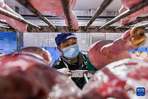 11月6日,在浙江省金華金年火腿有限公司車間內(nèi),技師在堆疊火腿。(新華社發(fā) 時寬兵 攝)