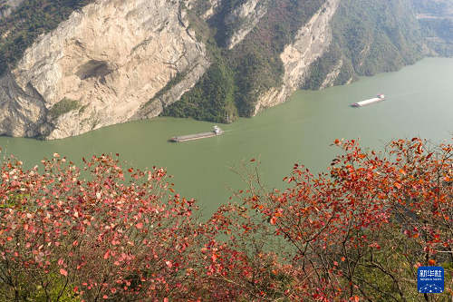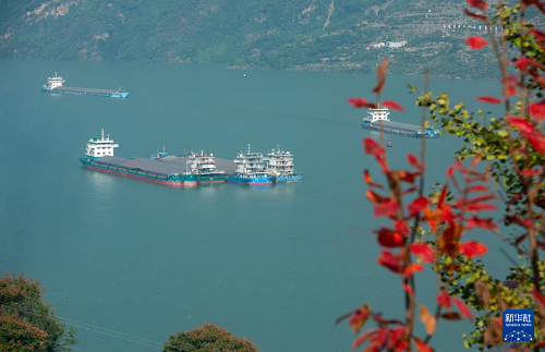11月16日,船舶行駛在湖北省宜昌市秭歸縣西陵峽水域(無(wú)人機(jī)照片)。(新華社發(fā) 王罡 攝)