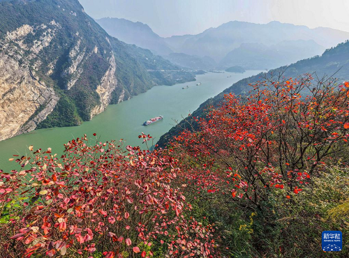 11月16日,船舶行駛在湖北省宜昌市秭歸縣西陵峽水域(無(wú)人機(jī)照片)。(新華社發(fā) 雷勇 攝)
