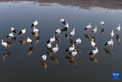 11月30日,東方白鸛在河北省唐山市豐南區(qū)沿海濕地水面上覓食(無人機(jī)照片)。(新華社記者 楊世堯 攝)