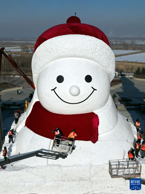 12月14日,正在建設中的哈爾濱群力音樂公園網(wǎng)紅大雪人頭部已完成,露出憨態(tài)可掬的笑容。今年回歸的大雪人將在保留紅帽子、紅圍脖、紅色愛心紐扣“經(jīng)典皮膚”的基礎上,再次升級。設計身高19米、長14米、寬11米,比往年“長高”1米,總用雪量超過3000立方米,比往年增加1200立方米,達到歷年之最。