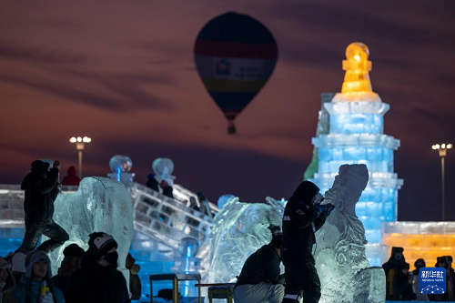 1月3日,參賽選手在哈爾濱冰雪大世界園區(qū)內(nèi)進行冰雕創(chuàng)作。(新華社記者 張濤 攝)
