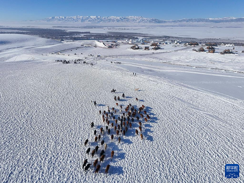 這是1月3日在新疆昭蘇濕地公園拍攝的“天馬踏雪”表演(無人機照片)。(新華社記者 胡虎虎 攝)