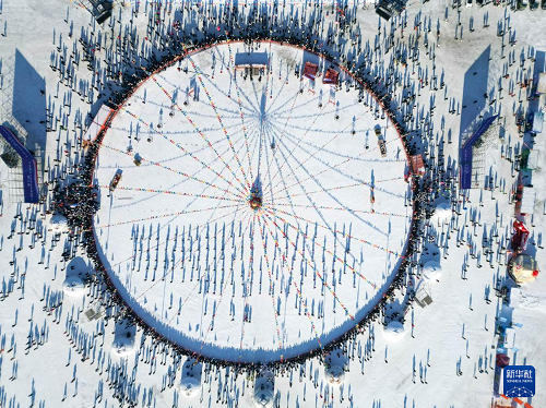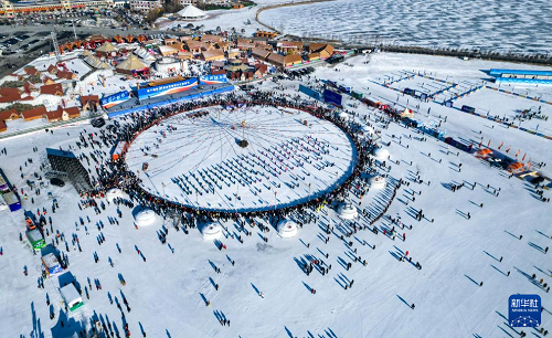 1月8日,在吉林省松原市,人們參加吉林·查干湖第24屆冰雪漁獵文化旅游節(jié)開(kāi)幕式(無(wú)人機(jī)照片)。(新華社記者 顏麟蘊(yùn) 攝)