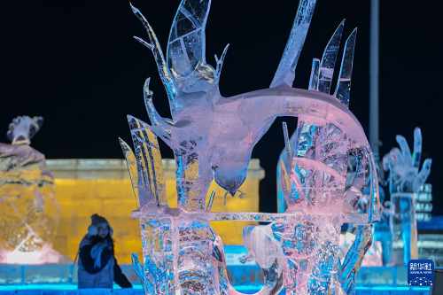 1月13日,游客從哈爾濱冰雪大世界園區(qū)內(nèi)的冰雕作品《森林仙子》旁經(jīng)過。(新華社記者 王建威 攝)