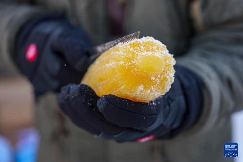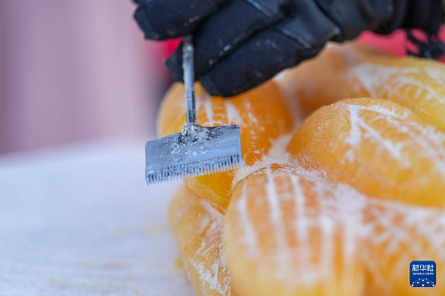 1月28日,冰雕師在第二十七屆哈爾濱冰雪大世界園區(qū)展示植物彩色冰雕。(新華社記者 王松 攝)