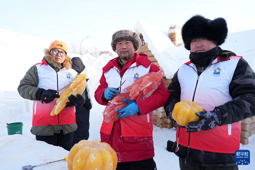1月28日,冰雕師在第二十七屆哈爾濱冰雪大世界園區(qū)雕刻植物彩色冰雕。(新華社記者 王松 攝)