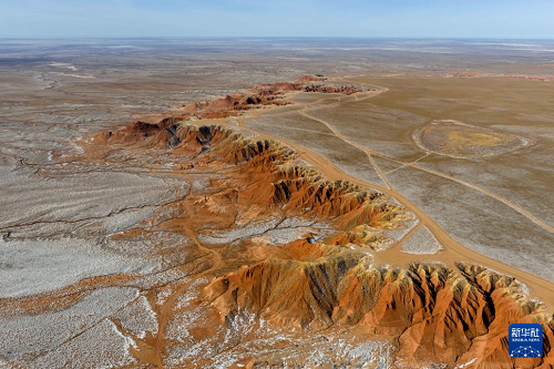 這是1月29日在內(nèi)蒙古烏蘭察布市四子王旗拍攝的紅崖臺(tái)地景觀(無(wú)人機(jī)照片)。(新華社記者 貝赫 攝)