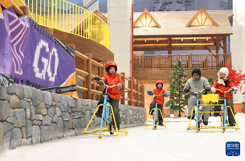 2月3日,游客在雪道上騎雪上自行車。(新華社記者 方喆 攝)