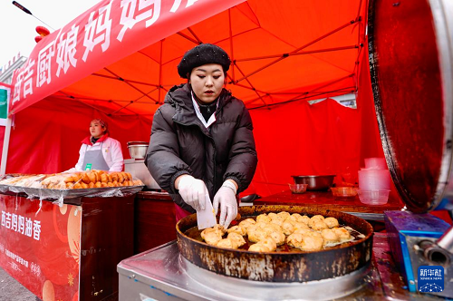 2月3日,商戶在寧夏固原市西吉縣年貨大集上制作小吃。(新華社記者 楊植森 攝)