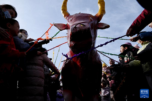 2月4日,人們?cè)诟拭C省敦煌市白馬塔景區(qū)“打春牛”。(新華社發(fā) 張曉亮 攝)