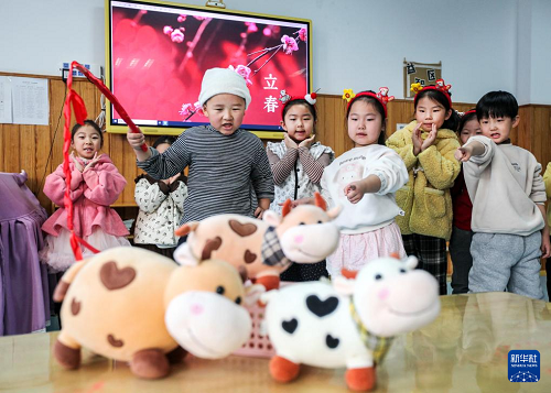 2月4日,在河南省焦作市博愛(ài)縣縣直幼兒園,小朋友做“打春?!庇螒?。(新華社發(fā) 程全 攝)