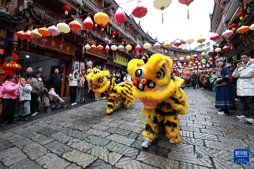 2月5日,人們在貴州省都勻市石板街觀看布依族婚俗表演。(新華社發(fā) 肖偉 攝)