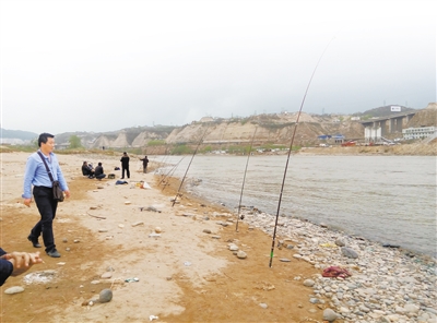 當日下午3時許,蘭州晨報記者在雁白大橋西側(cè)的黃河岸邊看到12把魚竿一字排開,3名釣魚者坐在旁邊沙灘上正在等待魚兒上鉤,還有兩名中年男子正在周圍撒網(wǎng)。在相隔十多米處,記者發(fā)現(xiàn)還有兩名男子分別撐著魚竿釣魚,有一名捕魚者在撒網(wǎng)?!斑@是雙面粘漁網(wǎng),河內(nèi)稍大一些的魚兒只要撞進網(wǎng)里就擺脫不了?!币幻遏~男子得意地說。