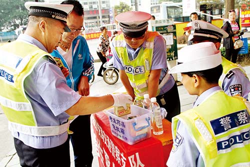 考試期間,市公安局交警支隊在各考點設置了便民服務點,備好遮陽傘、雨傘、保溫水桶、礦泉水和考試專用的鋼筆、橡皮。便民服務臺還放置一個小藥箱,里面?zhèn)溆星鍥鲇汀⒎朗钏?、藿香正氣水、感冒藥、腹瀉藥、速效救心丸、降壓藥等應急藥品,以防考生及家長急用。