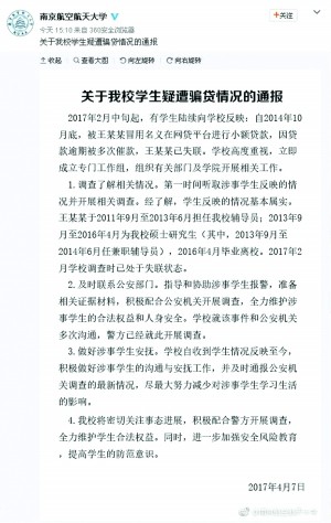 在4月7日下午,“@南京航空航天大學(xué)”官微發(fā)布了“關(guān)于我校學(xué)生疑遭騙貸情況的通報(bào)”,通報(bào)稱,從2017年2月中旬起,有學(xué)生陸續(xù)向?qū)W校反映,自2014年10月底,被王某冒用名義在網(wǎng)貸平臺(tái)進(jìn)行小額貸款,因貸款逾期被多次催款,王某已失聯(lián)。學(xué)校高度重視,立即成立專門(mén)工作組,組織有關(guān)部門(mén)及學(xué)院開(kāi)展相關(guān)工作。經(jīng)調(diào)查了解,學(xué)生反映的情況基本屬實(shí)。