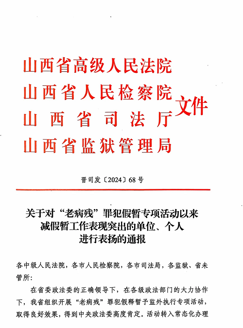 近日,山西省高級(jí)人民法院、山西省人民檢察院、山西省司法廳、山西省監(jiān)獄管理局印發(fā)《關(guān)于對(duì)“老病殘”罪犯假暫專項(xiàng)活動(dòng)以來減假暫工作表現(xiàn)突出的單位、個(gè)人進(jìn)行表揚(yáng)的通報(bào)》,對(duì)減假暫工作表現(xiàn)突出的16家單位和25名個(gè)人予以通報(bào)表揚(yáng),忻州中院審判監(jiān)督庭獲評(píng)“全省減假暫工作表現(xiàn)突出單位”。