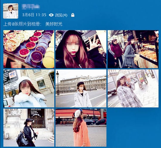 “最好找粉絲在10萬以下的網(wǎng)紅?!痹谖⒉┥?,魏強(qiáng)嫻熟地搜到一個名為“Panny”的模特,點擊其關(guān)注的好友,找到類似幾名網(wǎng)紅,讓記者下載她們的照片,用修圖軟件清除圖片上的水印,再上傳到QQ空間。魏強(qiáng)在QQ上假扮的“白富美”網(wǎng)名叫“Eiffel”,他還煞費苦心地更新“Eiffel”的QQ空間。