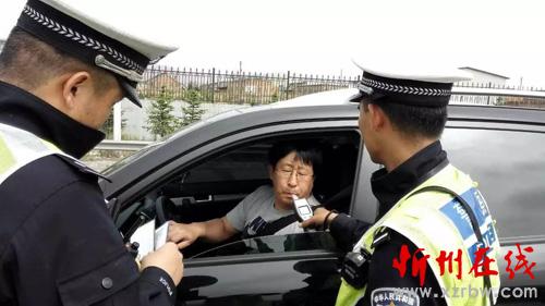 九大隊民警正在對過往司機進行酒精測試