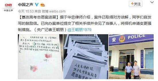 備受關注的山東青島膠州高三畢業(yè)生常升高考志愿被 同學郭某某篡改一事有最新進展。案件已取得對方諒解,同學們自發(fā)寫鼓勵信。已向辦案單位提交了相關手續(xù)并會見了當事人,將擇機申請變更強制措施。(來源:中國之聲)