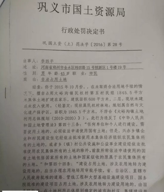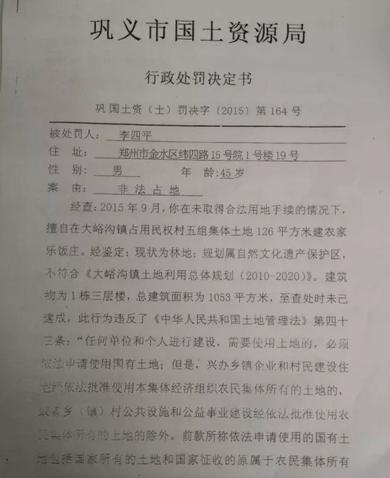 據(jù)記者獲取的材料顯示,2015年12月份,鞏義市國(guó)土資源局對(duì)李四平進(jìn)行處罰,案由為“非法占地”。李四平擅自占用集體土地126平方米,建設(shè)農(nóng)家樂,土地性質(zhì)為林地。對(duì)其處罰為“自行拆除在非法占用的126平方米土地上新建的建筑物和其他設(shè)施,恢復(fù)土地原狀”“對(duì)非法占用的126平方米土地,按每平方米3元處以罰款,共378元。”