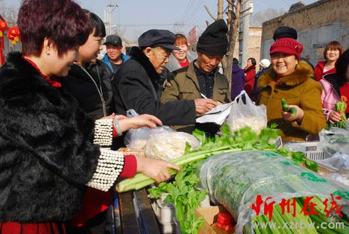 春節(jié)期間農(nóng)村市場依然旺,城里商家還要到村里賣菜。正月初三攝于代縣西馬村。(楊峻峰 攝)