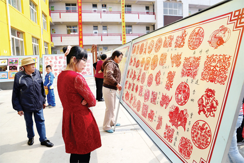 近日,靜樂縣利民小學(xué)舉辦校園書法、繪畫和剪紙作品展。據(jù)悉,此次活動共收到美術(shù)作品300 余件、書法作品300 余件、剪紙作品600 件。通過一件件作品表達了孩子們對美麗“中國夢”的憧憬。圖為學(xué)生和家長在參觀展覽。(閆曉梅 攝)