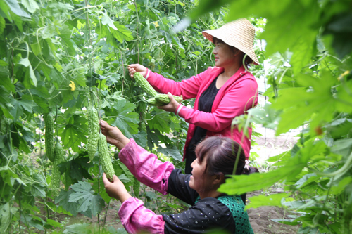 7月16日,原平市新原鄉(xiāng)解放街村菜農管仲衛(wèi)蔬菜種植基地,員工們正在采摘長勢喜人的苦瓜,老管種植蔬菜已有30多個年頭,近年來他每年種植和育苗六個系列40多個品種蔬菜,成為了遠近聞名的種植大戶和種植能手,并且成為當?shù)厥卟朔N植的帶頭人,有效地促進了增產增收共同致富,鼓起了他們的錢袋子。(趙春曉 攝)