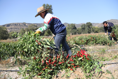 10月8日,靜樂(lè)縣永倉(cāng)種植專業(yè)合作社萬(wàn)畝辣椒種植示范園中10300畝辣椒喜獲豐收。近年來(lái),該縣調(diào)整產(chǎn)業(yè)結(jié)構(gòu),大力發(fā)展無(wú)公害辣椒種植,引進(jìn)種植新品種韓國(guó)紅辣椒。該合作社今年連片訂單栽植的10300 畝辣椒目前長(zhǎng)勢(shì)良好,預(yù)計(jì)平均畝產(chǎn)6000 斤,最高可達(dá)一萬(wàn)斤。今年又是一個(gè)豐產(chǎn)年,大伙的生活就像紅辣椒一樣過(guò)得紅紅火火。圖為合作社工人在收獲辣椒。(閆曉梅 攝)