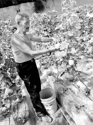 4月11日,忻府區(qū)部落村金山農(nóng)業(yè)示范園區(qū),68歲的村民馮永安在自己的大棚內(nèi)采摘香瓜。七年前,他敢嘗敢試開(kāi)始種植大棚香瓜,每到這個(gè)香瓜上市的季節(jié),他和老伴吃住在大棚,精心待弄這些寶貝疙瘩,光這一畝大棚香瓜,每年都可以給他帶來(lái)十萬(wàn)元左右的收入。尤其是近兩年,他自創(chuàng)科學(xué)方法,改良連種土壤,使香瓜的品質(zhì)、產(chǎn)量都保持穩(wěn)定勢(shì)頭,深受市場(chǎng)歡迎。他不僅帶動(dòng)本村村民共同致富,而且為慕名而來(lái)的同行熱心傳授技術(shù),成為遠(yuǎn)近聞名的大棚香瓜種植專(zhuān)家。本報(bào)記者 聶艷英 攝