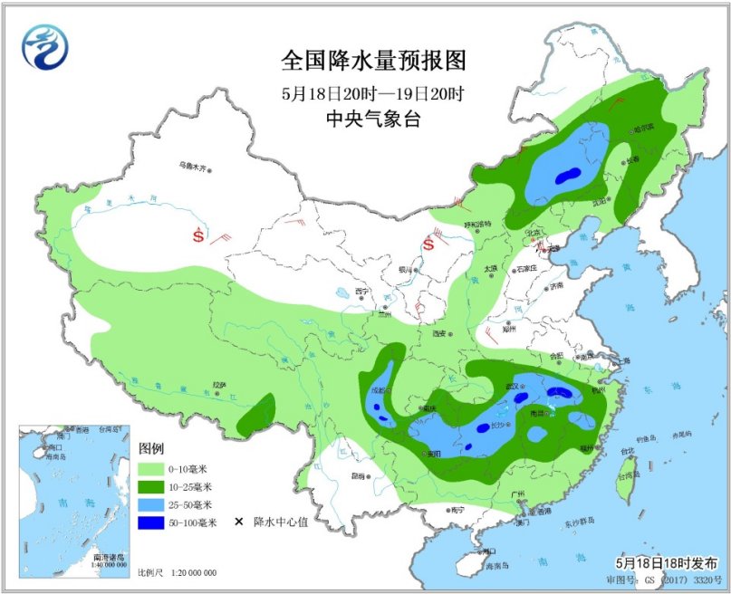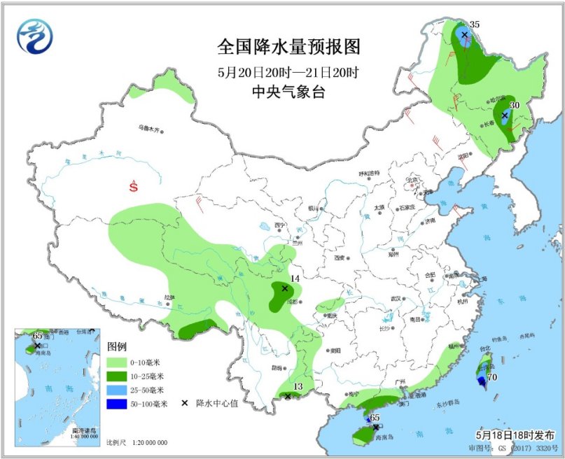 全國降水量預(yù)報(bào)圖(5月18日20時(shí)-19日20時(shí)) 5月19日20時(shí)至20日20時(shí),內(nèi)蒙古東北部、東北地區(qū)中北部、江南南部和東部、華南大部等地的部分地區(qū)有中到大雨,局地有暴雨(50~70毫米)。內(nèi)蒙古中東部、華北、黃淮、東北地區(qū)中南部等地的部分地區(qū)有4~6級(jí)風(fēng),陣風(fēng)7~8級(jí)。南疆盆地等地局地有揚(yáng)沙或浮塵。渤海西南部海域?qū)⒂?~8級(jí)、陣風(fēng)9~10級(jí)的西北風(fēng)。
