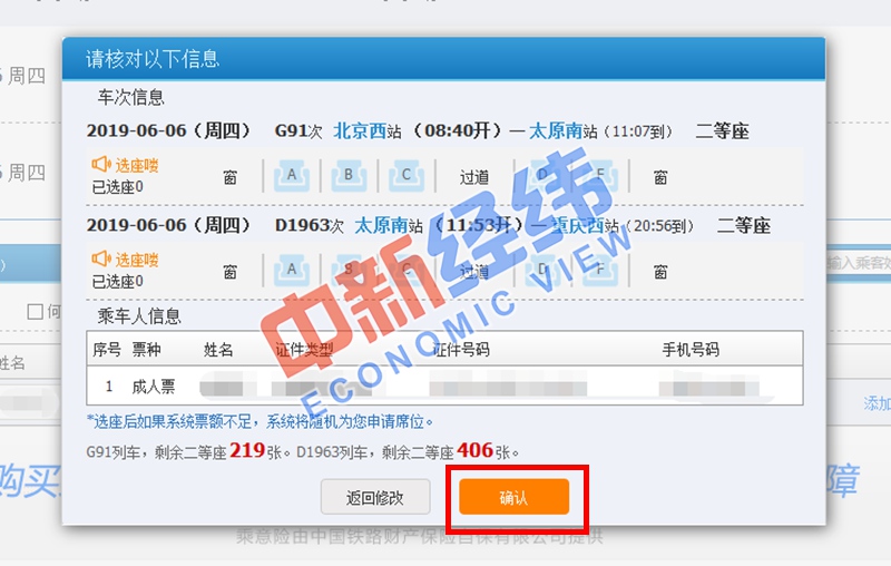 4、一切準(zhǔn)備就緒后,就可進(jìn)行車票預(yù)訂了。點(diǎn)擊“預(yù)訂”后,系統(tǒng)會(huì)再次對(duì)換乘信息進(jìn)行提示,確認(rèn)無(wú)誤后選擇對(duì)應(yīng)車次所需席別,添加乘車人信息。
